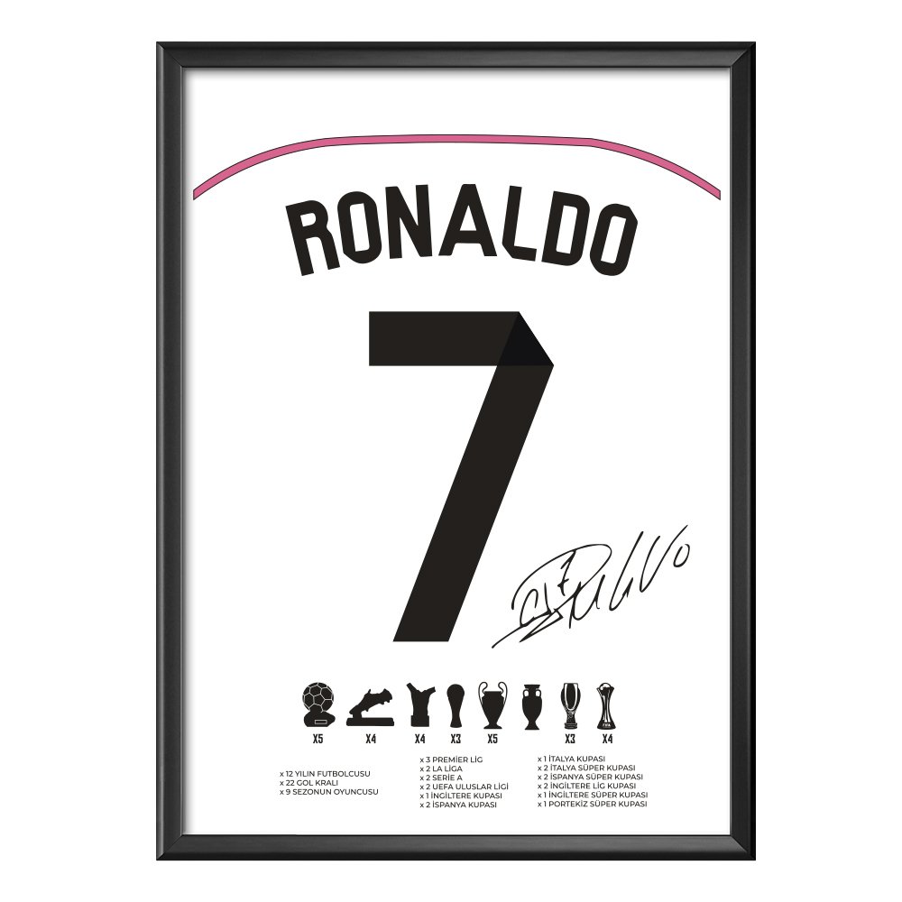 Cristiano Ronaldo 7 Real İmzalı Çerçeveli Forma Posteri %100 doğal ahşap çerçeveli, parlak kuşe kağıda yüksek kaliteli baskı. 3 farklı renk, 3 farklı boyut seçeneğiyle sizlerle!